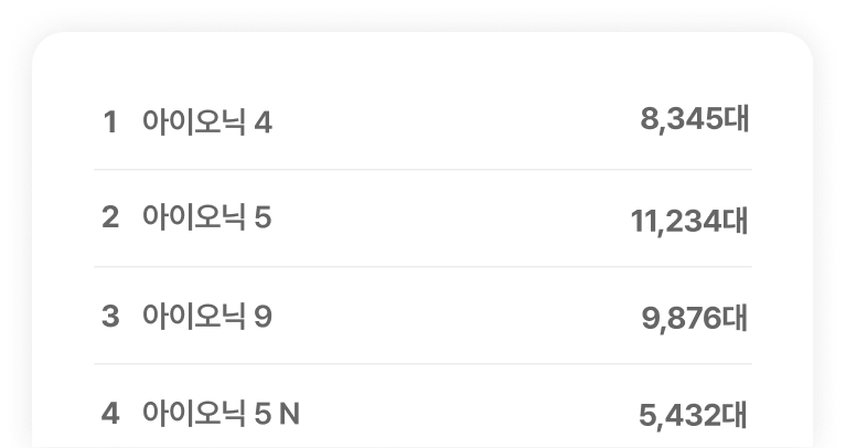 연식판매시점주행거리사고유무차량상태신차가격판매가격잔가율옵션항목옵션가격색상용도판매지역수출유무유찰기록2022년 3월2022년 3월36,000km사고(1)A(1)5,000만원3,000만원60%1개500만원흰색렌트수도권미수출0번2022년 3월2022년 3월36,000km무사고A(1)5,000만원3,000만원60%0개500만원흰색렌트수도권미수출0번2022년 3월2022년 3월36,000km무사고A(1)5,000만원3,000만원60%0개500만원흰색렌트수도권미수출0번